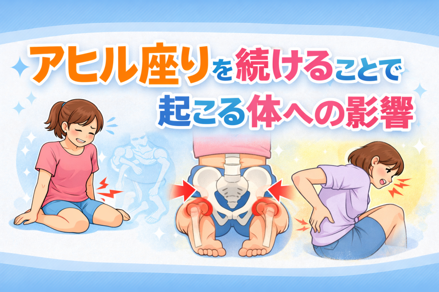 アヒル座りは、股関節が内側に回った状態で膝を曲げる姿勢になります。そのため、股関節だけでなく膝の関節にも負担がかかることがあると言われています。