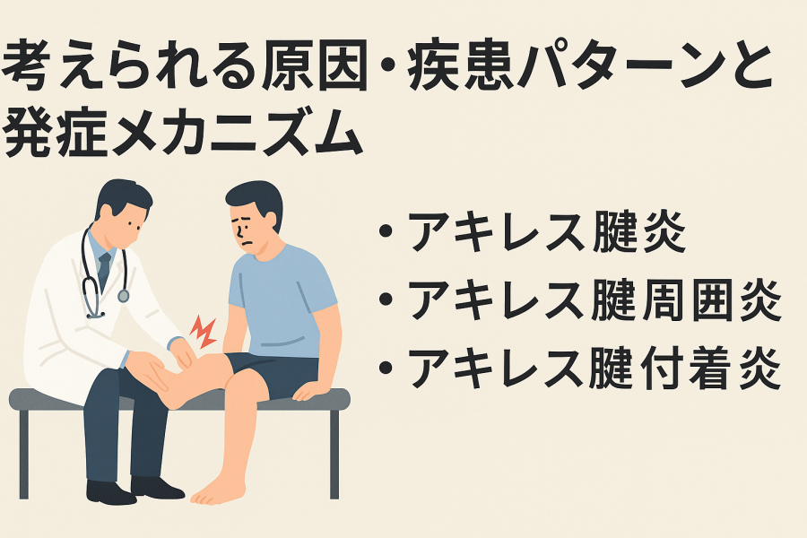 「アキレス腱の上が痛い」と感じるとき、その背景にはいくつかの疾患や要因が関係していると言われています。痛みが出る部位やタイミングによって原因は異なりますが、代表的なパターンを整理しておくことで、状態をより正確に把握しやすくなります。