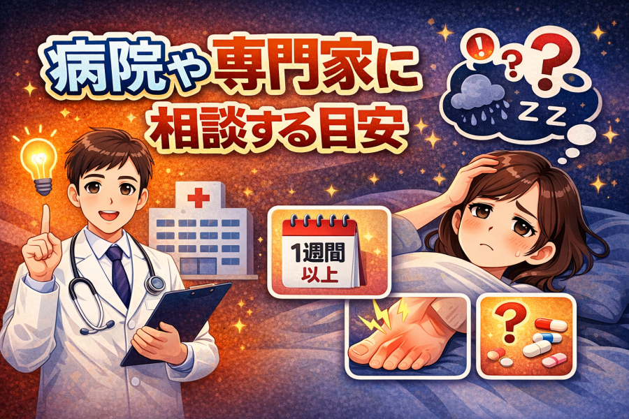 足が痛くて眠れない状態が続くと、不安になりますよね。多くの場合は一時的な疲労や血行の影響と言われていますが、中には専門家への相談を考えたほうがよいケースもあるとされています。ここでは、来院を検討する目安を整理しておきます。