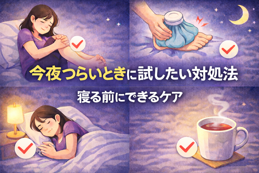 入浴で体をゆるめる、足元を冷やさないなど、小さな工夫の積み重ねが夜のつらさを和らげるヒントになるかもしれません。