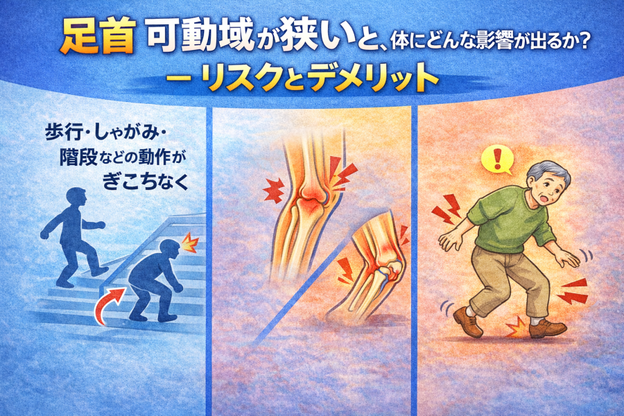 足首 可動域 狭い状態が続くと、歩行・姿勢・膝腰への負担が増える可能性があります。本記事では「なぜ足首が硬くなるのか」「どんなリスクがあるか」「自宅でできるストレッチやエクササイズ」「セルフチェック方法」をわかりやすく解説します。
