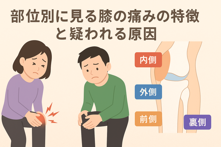 膝の痛み 場所ごとに「どこが痛いか」で原因が異なると言われています。内側・外側・前・裏など部位別に疑われる疾患と、日常でできる対処法をわかりやすく解説します。早めのケアで膝の不安を軽くしましょう。