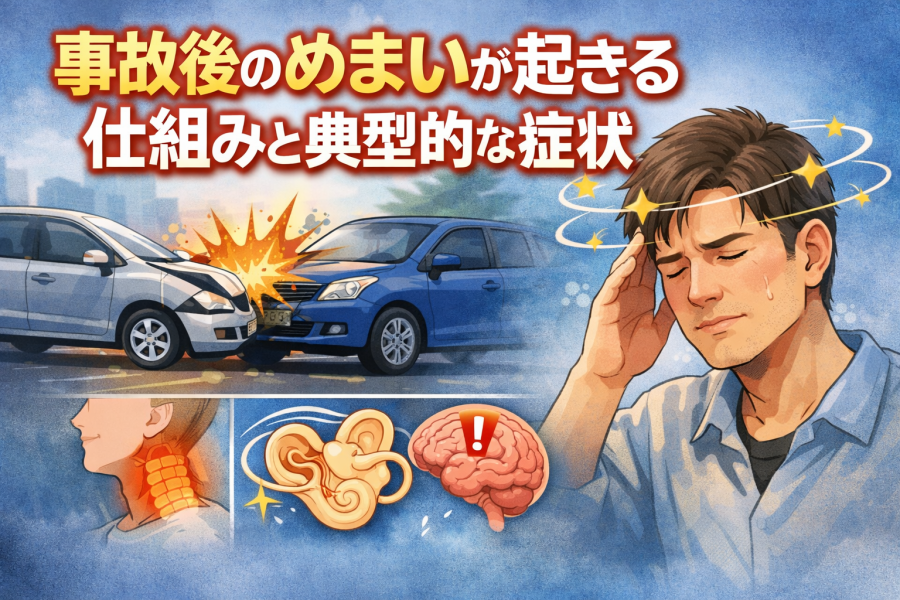 よく言われているのは、首への強い衝撃による“むち打ち”の影響です。首まわりの筋肉や靭帯が緊張すると、平衡感覚や自律神経の働きに影響が出ることがあると言われています。また、事故の衝撃が内耳(体のバランスを司る部分)に影響するケースもあると報告されています。