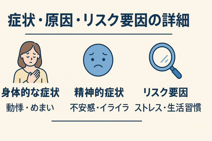 体の症状だけでなく、心の面に影響が出るケースも多いとされています。「不安感」「イライラ」「抑うつ傾向」「集中力の低下」「意欲の減退」などが代表的です。こうした症状は周囲から見えづらいため、自分自身も「気のせいではないか」と悩んでしまうことが少なくないと言われています。特に仕事や家庭でストレスが強いと、症状が悪化しやすい傾向があると考えられています(引用元:同上)。