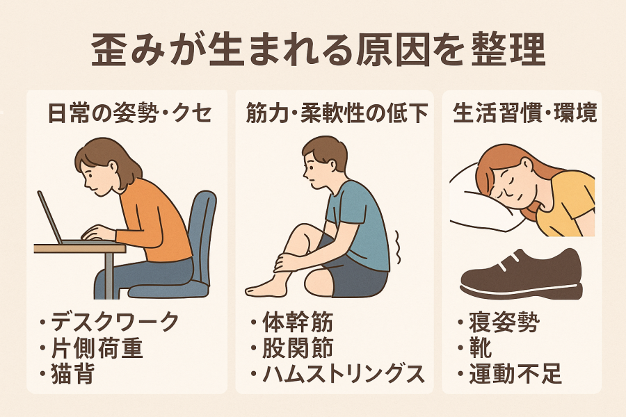 また、座りっぱなしの時間が長い人は骨盤の動きが少なく、支える筋肉が衰えやすくなるとも言われています。つまり、日常生活の“ちょっとした姿勢のくせ”が積み重なることで、知らぬ間に歪みが進んでしまうのです。