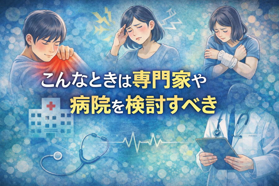 仕事に集中できない、家事がつらい、眠れないほど気持ち悪いなど、日常生活に影響が出ているときは、早めの相談が安心につながると考えられています。肩の違和感と気持ち悪さが続く背景には、筋肉だけでなく自律神経や内科的な原因が隠れている可能性もあると紹介されています。