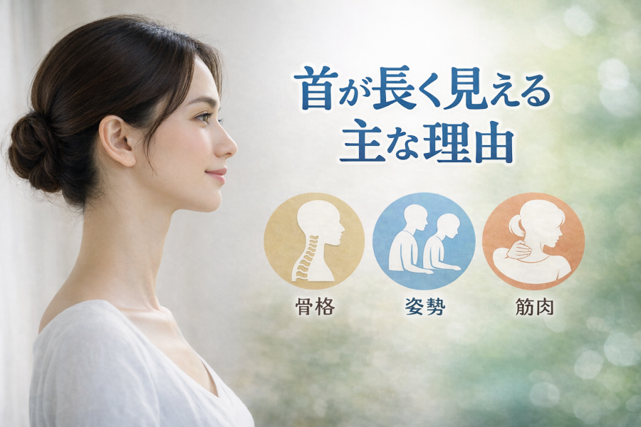 よく聞かれる質問ですが、実際には“骨格だけ”では説明できないと言われています。参考記事でも、首が長く見える理由には骨格の配置、姿勢、筋肉の状態が関係すると紹介されています(引用元:https://esthree.jp/column/%E9%A6%96%E3%81%8C%E9%95%B7%E3%81%84%E4%BA%BA%E3%81%AE%E7%89%B9%E5%BE%B4%E3%81%A8%E9%AD%85%E5%8A%9B/)。