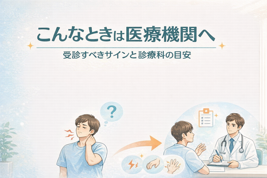 私もデスクワークが続いたときに首が重いまま数日続くことがありますが、「ただ疲れただけかな?」と思って様子をみながら、長引くようなら専門の医療機関で触診を受けるほうが安心だと感じることがあります。