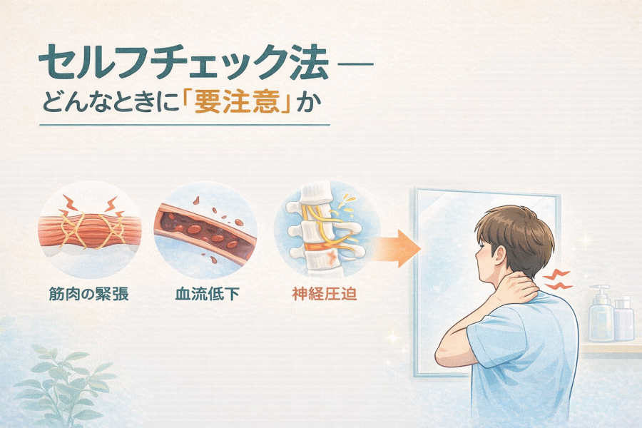 「朝起きたときに首が重い/痛い」「首を動かすと違和感」「肩まで張り感がある」「長時間同じ姿勢が多い」などのサイン。