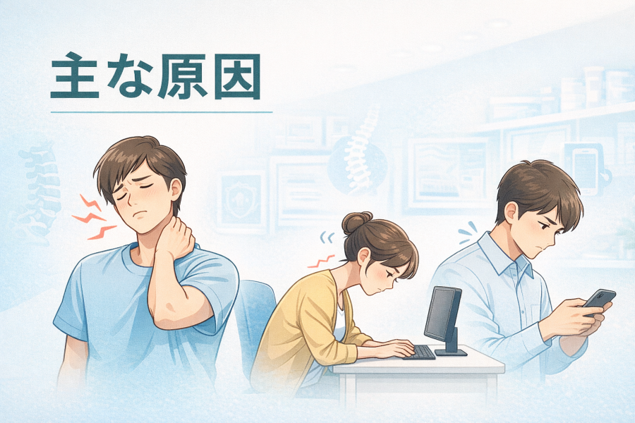 主な原因 ― 姿勢不良、長時間同じ姿勢、スマホ・PC操作による負荷