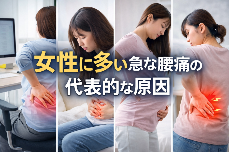 急な腰痛 女性】急に腰が痛くなった時の代表的な原因(ぎっくり腰・姿勢不良・ホルモン・婦人科疾患など)と、症状別の対処法・受診目安を医療情報を基にわかりやすく解説します。