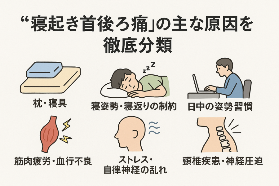 朝起きたときに「首の後ろが痛い」と感じる背景には、いくつかの要因が複雑に絡み合っていることが多いと言われています。単に「寝違えた」だけでなく、日頃の姿勢や寝具の状態、ストレス、血行なども関係している場合があります。ここでは、代表的な6つの原因をわかりやすく整理してみましょう。