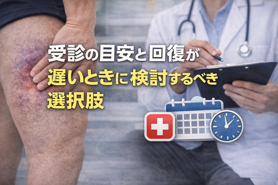 ここは判断が分かれやすいところです。一般的には、数日たっても痛みが強いまま続く場合や、腫れ・内出血がはっきり広がっている場合は、専門家への相談を検討する目安になると言われています。