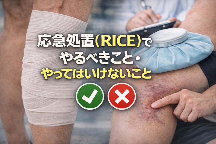 RICE処置の基本と注意点(温めすぎない・誤ったストレッチNGなど)。