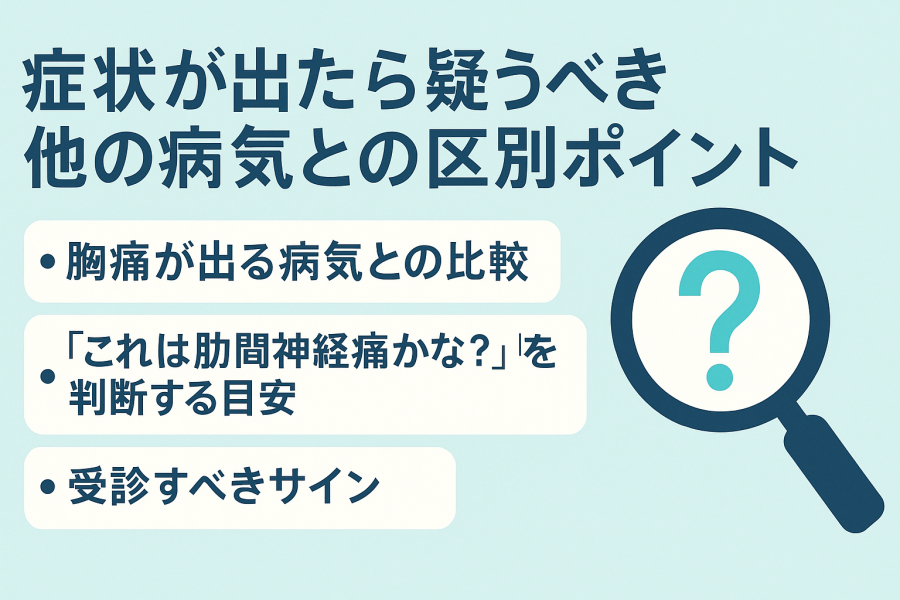 胸やわき腹・背中あたりに痛みが出た時、「肋間神経痛かも」と思っても、実はもっと重大な病気のサインであることもあります。体位・動作・呼吸で痛みが変わるか/安静でも続くかなどの“違い”をチェックして、自分の痛みの特徴を把握することが大切です。