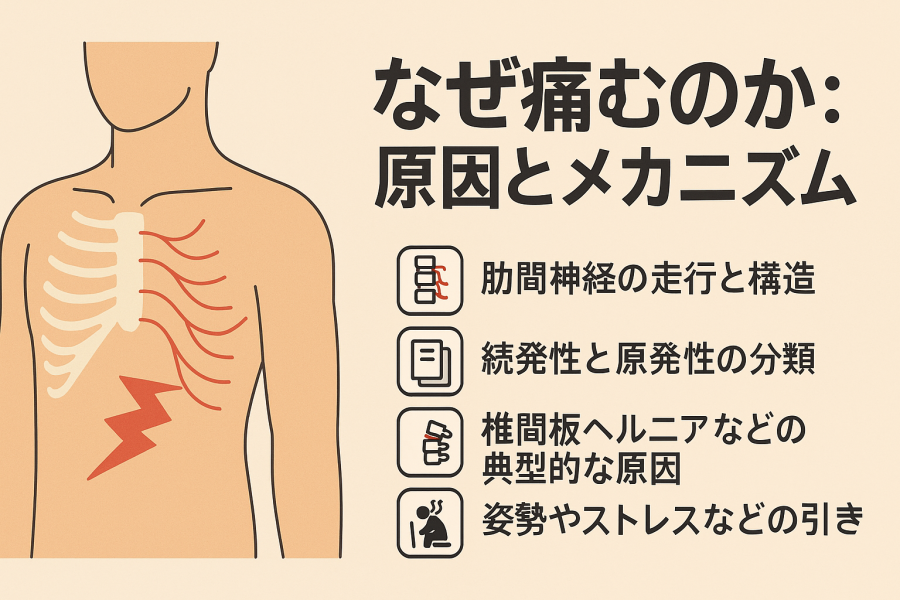 続発性では、病気や外傷、ウイルスなどがきっかけになるケースが多く、たとえば椎間板ヘルニアや肋骨骨折、帯状疱疹などが代表的です。一方で、原発性は「姿勢の乱れ」「筋肉の緊張」「ストレス」など、生活習慣の中で生じる神経の圧迫や血流の低下が関係していると考えられています。