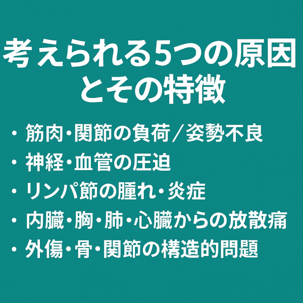 鎖骨下の痛みには、筋肉由来だけでなく神経・血管・リンパ節の異常 が関係していることもあります。このタイプの痛みは、ストレッチやマッサージだけでは改善しない場合もあるため、セルフケアの限界を知っておくことも重要です。 しびれ・むくみ・冷え・強い圧迫感などがある場合は、早めに専門家へ相談することがすすめられています。自分で判断して放置するよりも、早めに原因を確認するほうが安心です。