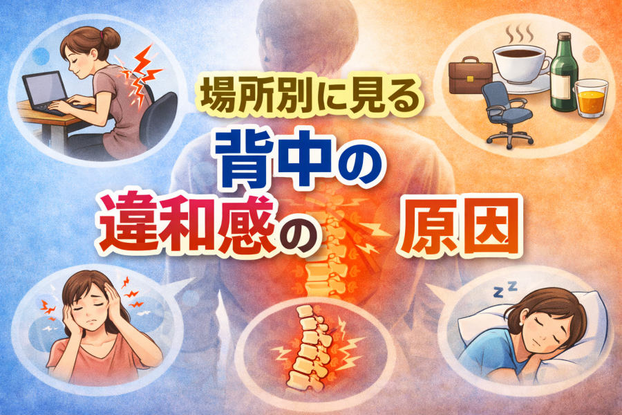 背中のモヤモヤした違和感は、出る位置によって関係している体の状態が異なることがあると言われています。筋肉だけでなく、内臓の影響が関係するケースもあるため、「どこに出ているか」をチェックすることがヒントになることもあります。