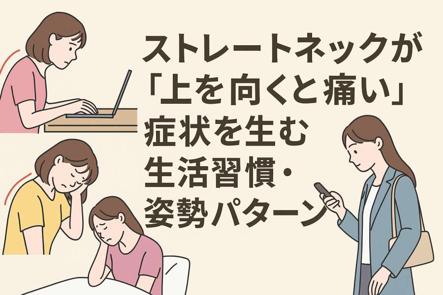 「ストレートネック 上を向くと痛い…と感じるあなたへ。なぜその動作で痛むのか、どんな姿勢・筋肉・頸椎の状態が関係するのかをわかりやすく解説し、今日からできるストレッチ・姿勢改善・受診の目安まで丁寧にお伝えします。」