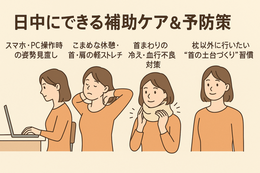 大切なのは、寝ながらケアを**“日常の姿勢改善や生活習慣の見直しとセットで行う”**こと。例えば「スマホの位置を上げる」「日中も軽く首を動かす」「デスク環境を整える」といった意識が重なってこそ、より良い変化につながると言われています。