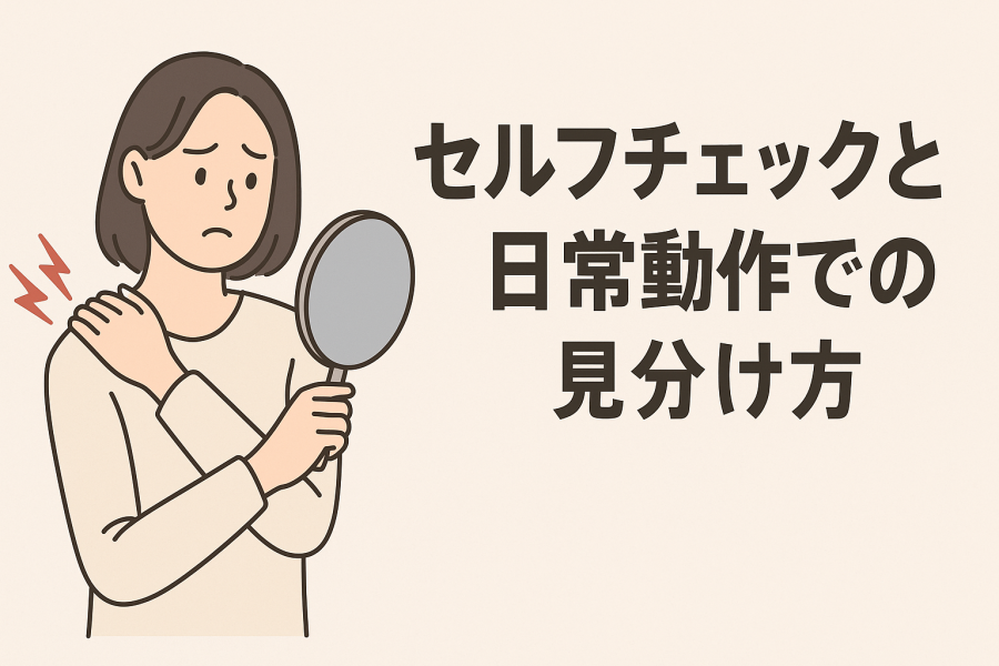 自宅でも簡単にできるチェック方法として、「鏡を使って左右の肩の高さを見る」「腕を上げ下げして可動域を確認する」「スマホで自分の姿勢を撮影してみる」などがあります。