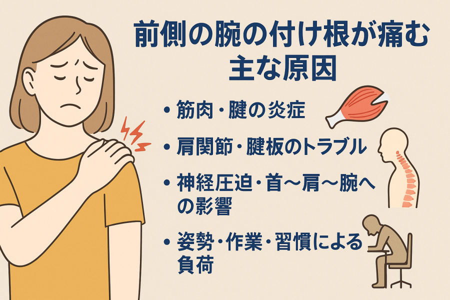 腕の付け根が痛い 前側でお悩みの方へ。原因として考えられる筋肉・腱・神経のトラブルを整理し、セルフケアのストレッチや受診を考える目安までわかりやすく解説します。