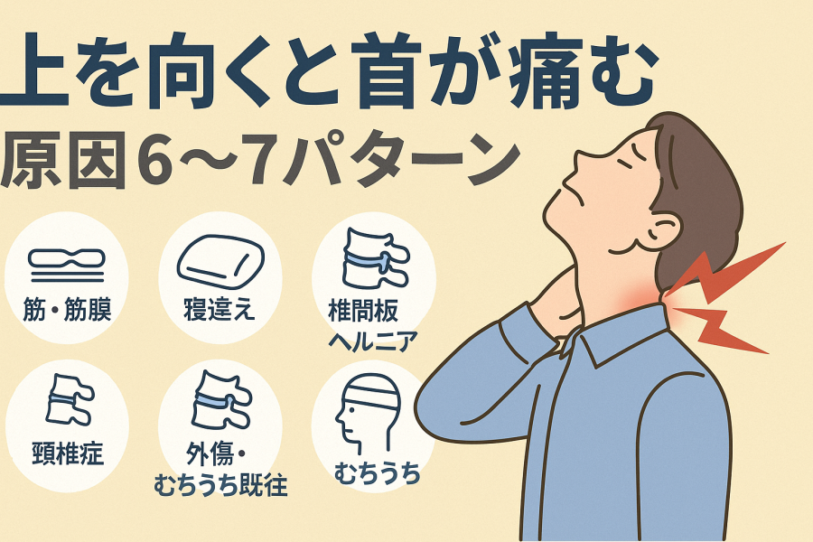 上を向くと首が痛い 原因を徹底解説。肩こり・寝違え・ストレートネック・頚椎疾患など原因別に見分け方を紹介し、自宅でできる対処法・受診タイミングまでわかりやすく解説します。
