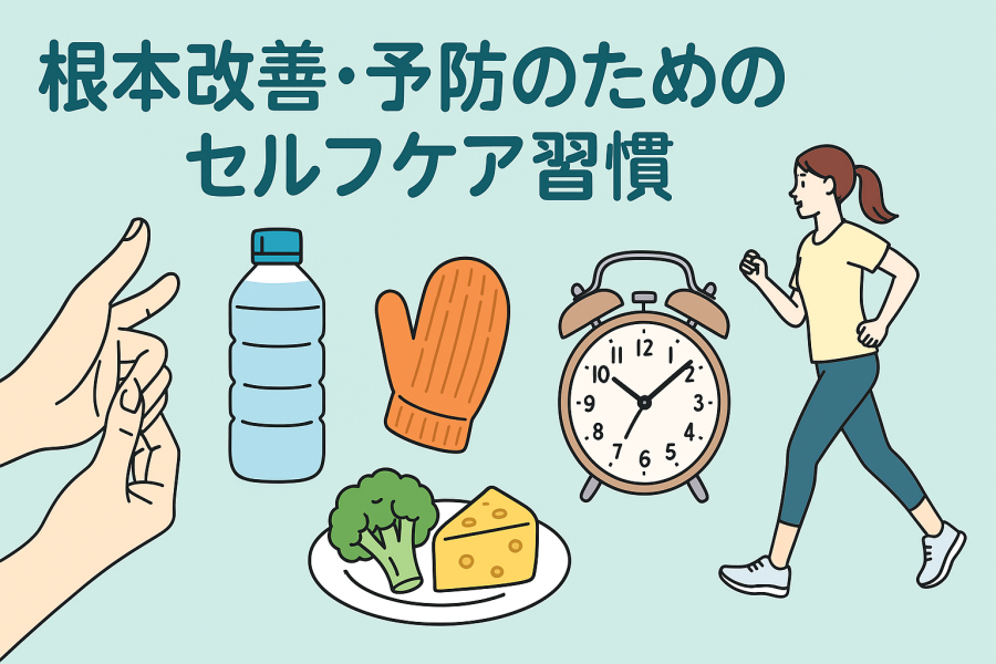 「痛みを無理して我慢する」「冷えた環境で長時間作業を続ける」「水分をあまり摂らない」といった習慣は、再発につながる可能性があると言われています。日常の中で小さな休憩を入れる、体を温める、水分や栄養を意識してとることが大切だと考えられています。