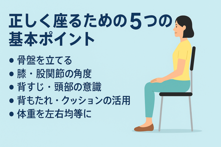 椅子に深く腰かけ、お尻の下で「坐骨(ざこつ)」を感じるように座るのがコツです。軽く背すじを伸ばし、骨盤のてっぺんがほんの少し前に傾くくらいが理想です。